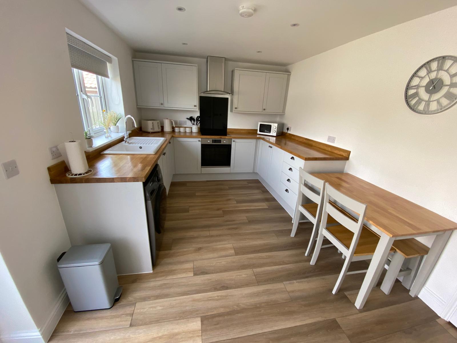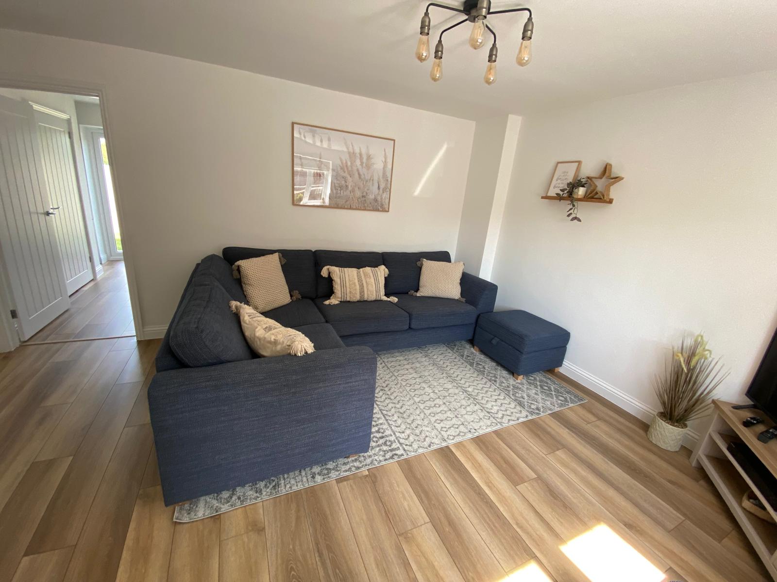 The house has been lovingly furnished and decorated to provide a relaxing and comfortable stay. Downstairs the house has a cosy living room with 55'' Freeview TV and a comfortable corner sofa plus footstools. There is a modern fully equipped kitchen with a dining table, plus downstairs cloakroom.